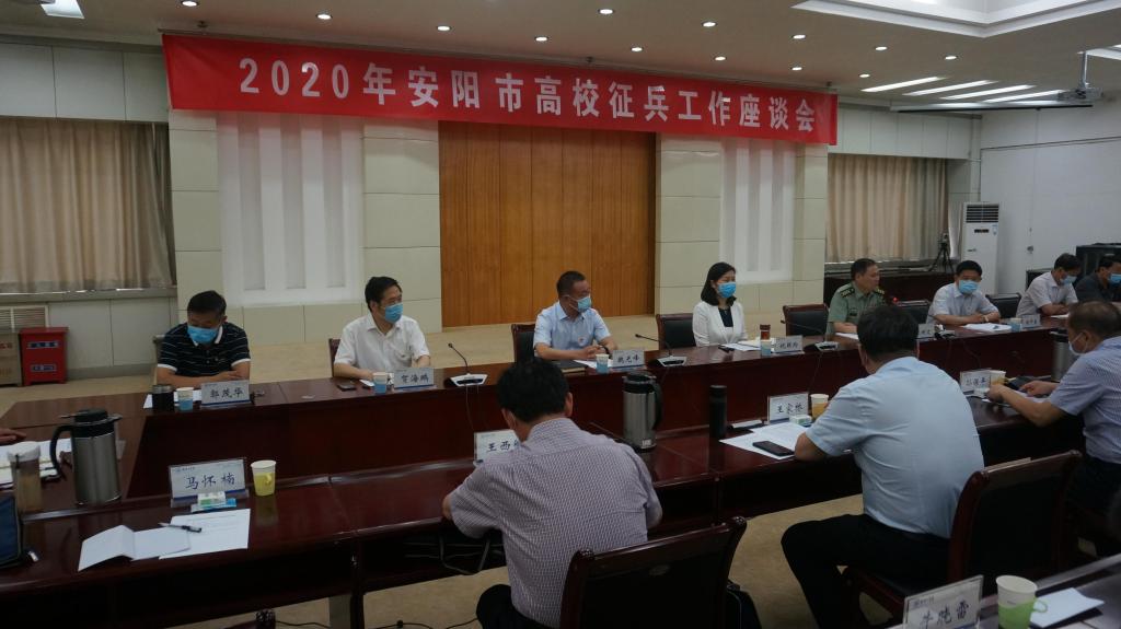 6月12日下午,2020年安阳市高校征兵工作座谈会在安阳工学院行政楼四楼会议室举行。安阳军分区司令员王树文主持会议,副市长祝振玲出席会议并讲话。我校领导任中普、孙保平及我市其他5所高校领导及市征兵办成员参加了座谈会。