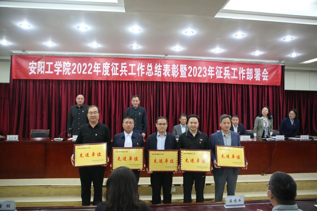 刘韶晖总结了2022年度征兵工作完成情况,并对2023年征兵工作进行了安排部署。学生工作部部长王振宇宣读了《关于表彰2022年度征兵工作先进单位和先进个人的决定》。与会领导为机械工程学院等11个2022年度征兵工作先进单位颁发了奖牌,并为11名获得安阳市征兵工作优秀辅导员的老师颁发了荣誉证书。艺术设计学院党总支书记凌云峰代表先进单位发言,飞行学院团总支副书记师路路代表先进个人发言。