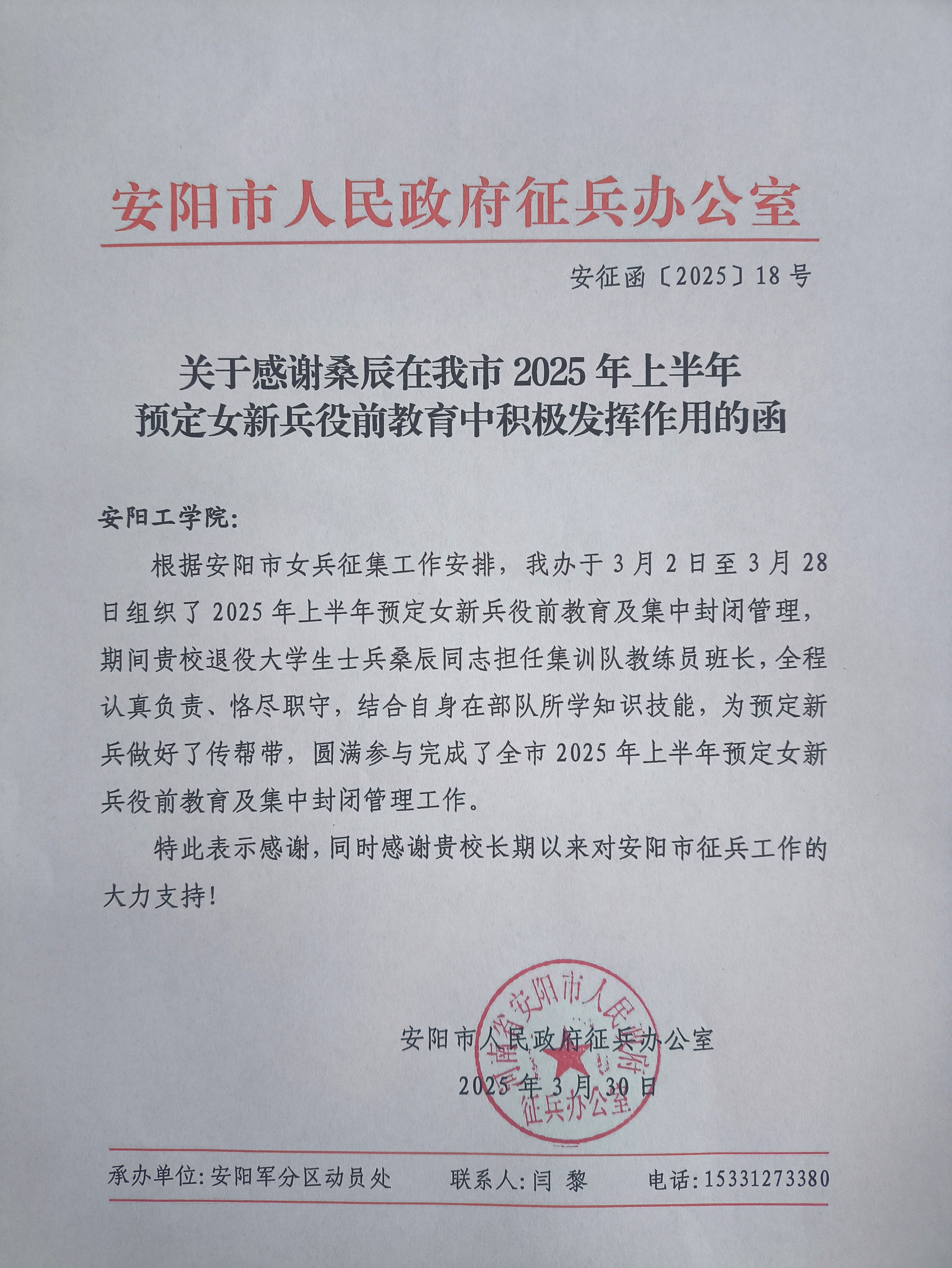 近日,安阳市人民政府征兵办公室发函,对我校土建与交通工程学院21级城乡规划专业退役大学生士兵桑辰在2025年上半年预定女新兵役前教育中发挥积极作用的表现进行感谢。